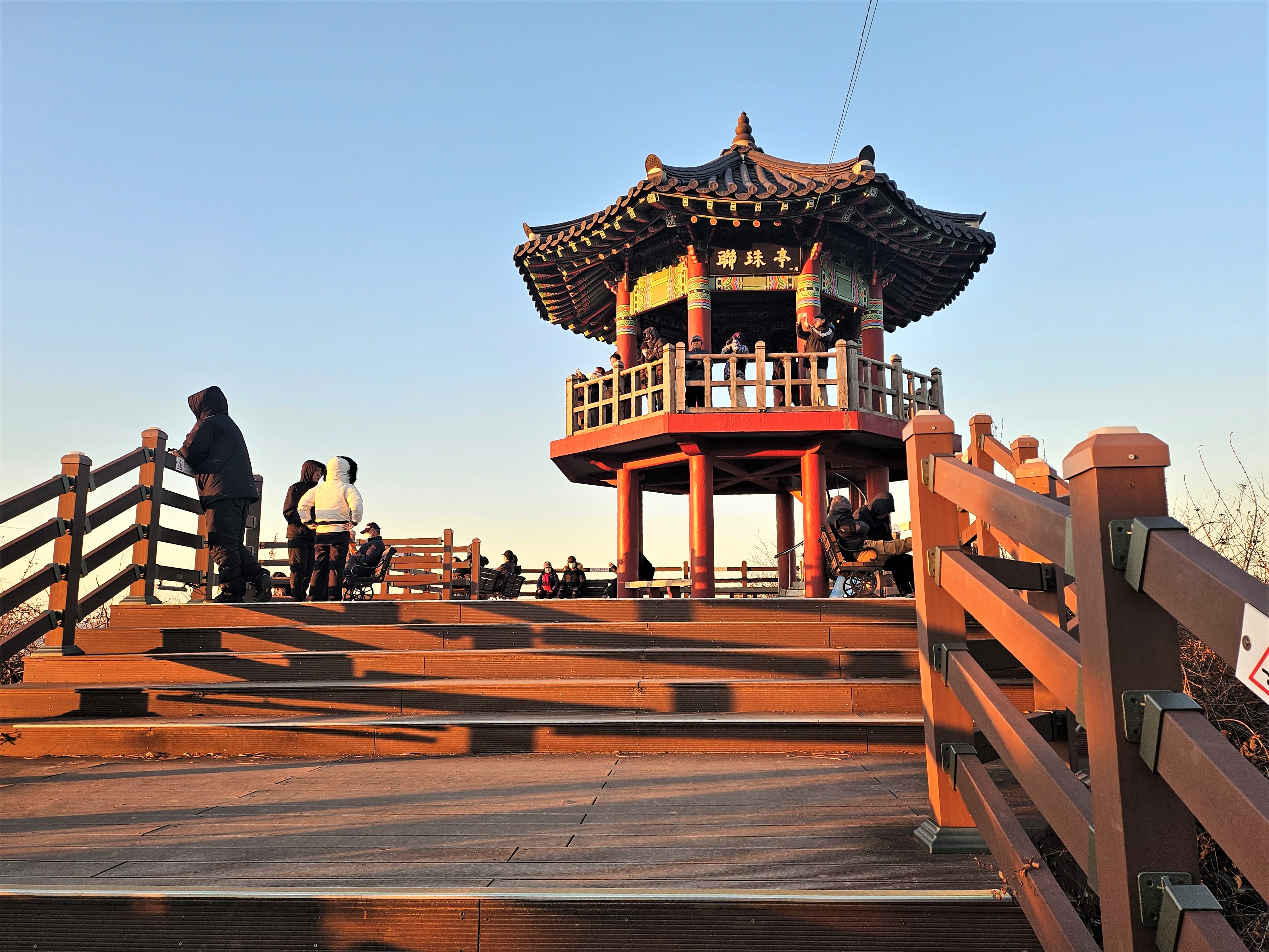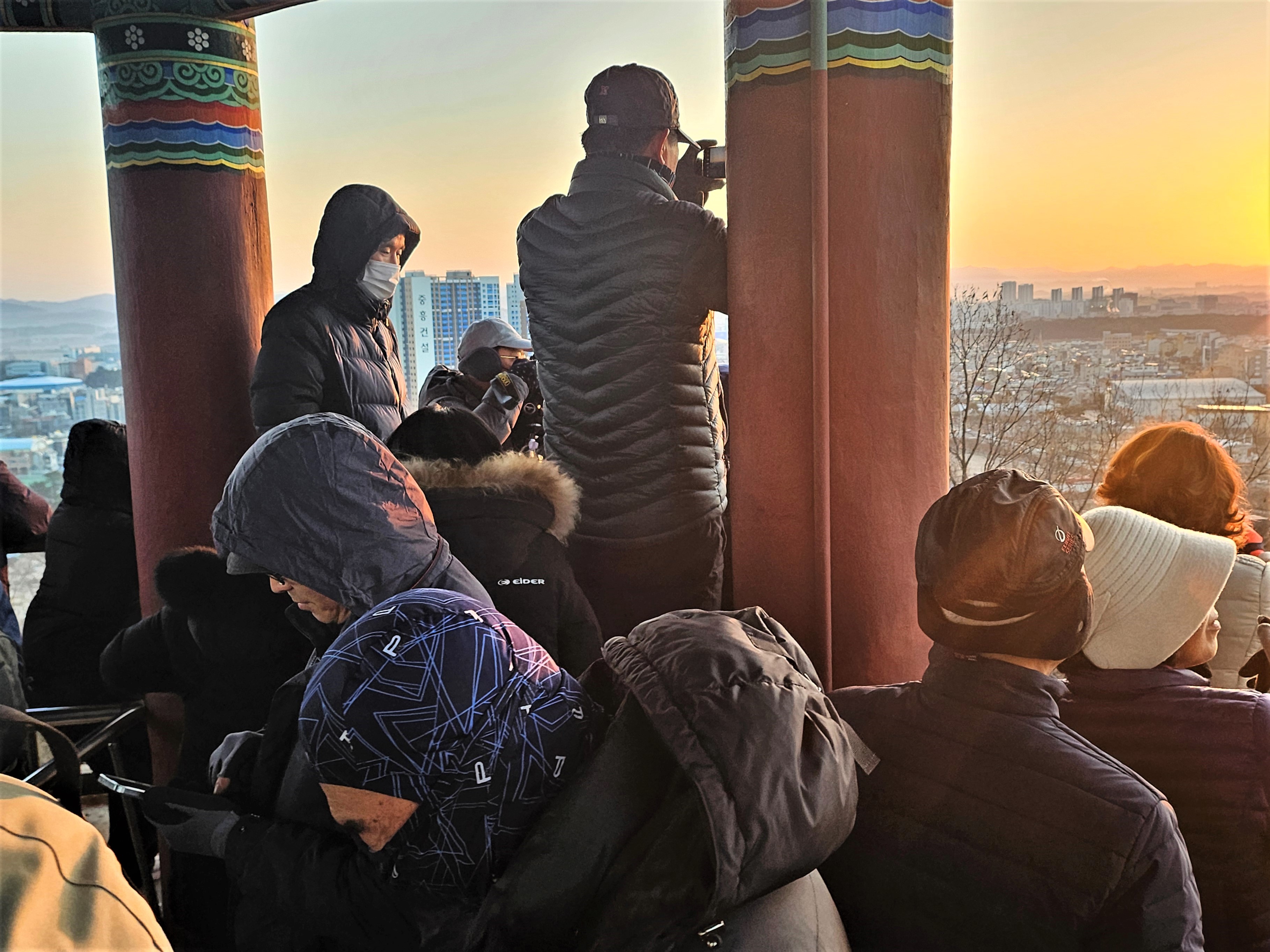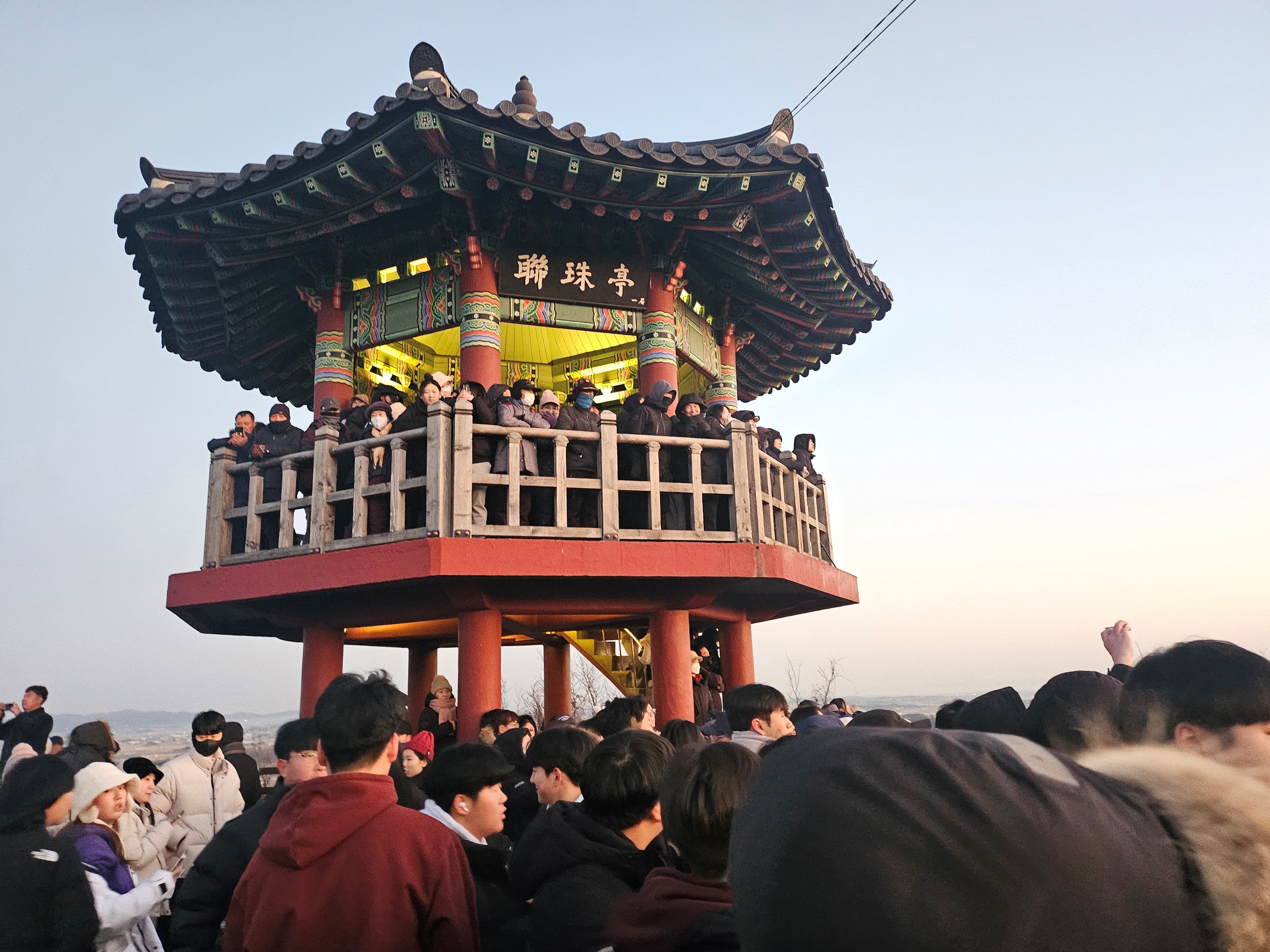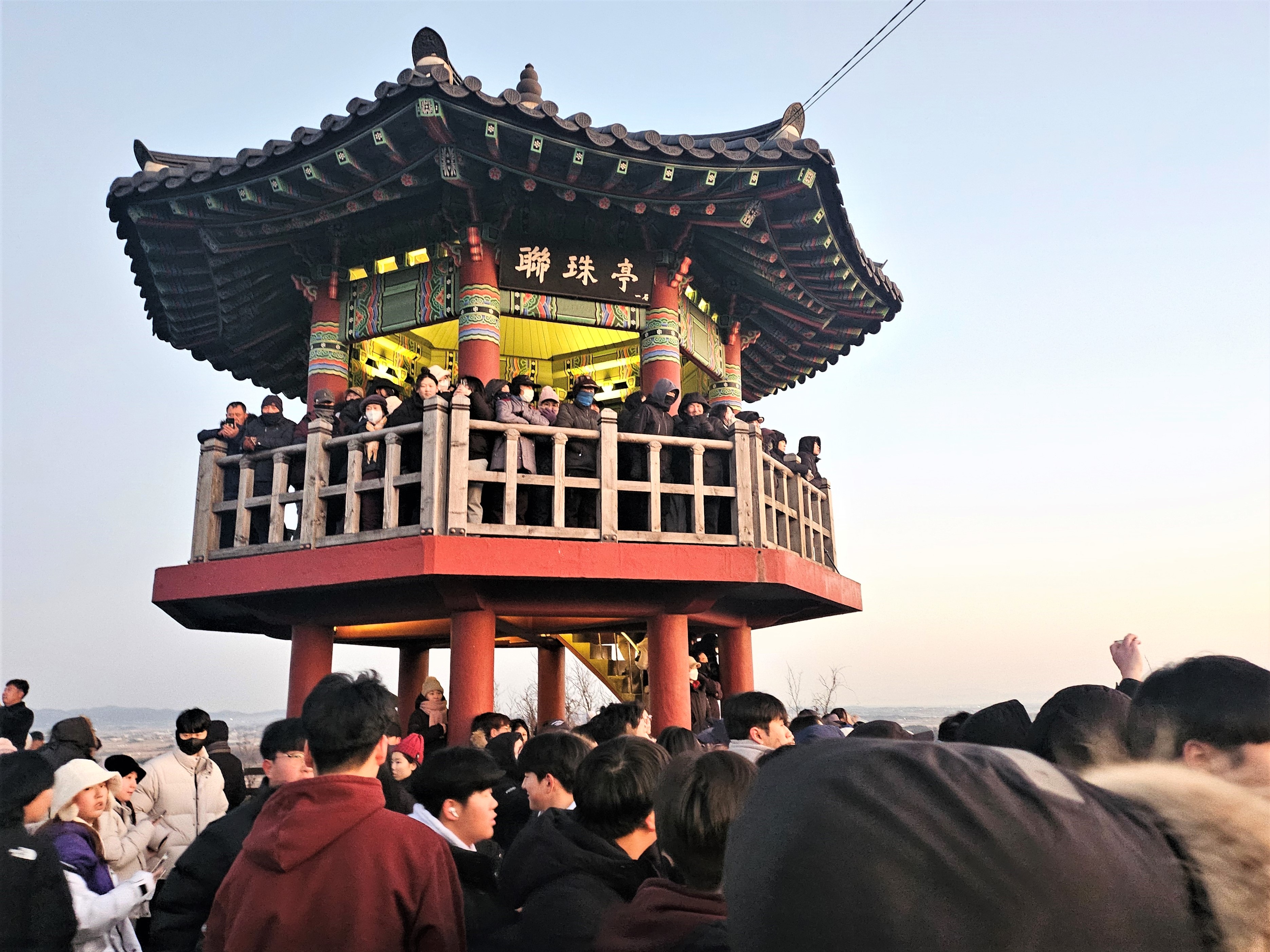 연주정 2층 일출 관람하기 좋은 장소는 이미 몸을 움직이지 못할 정도로 겹겹이 인파들로 꽉 들어찼고요. 작은 키에 과연 새해 첫 일출을 볼 수 있을까? 걱정이 태산이었습니다.