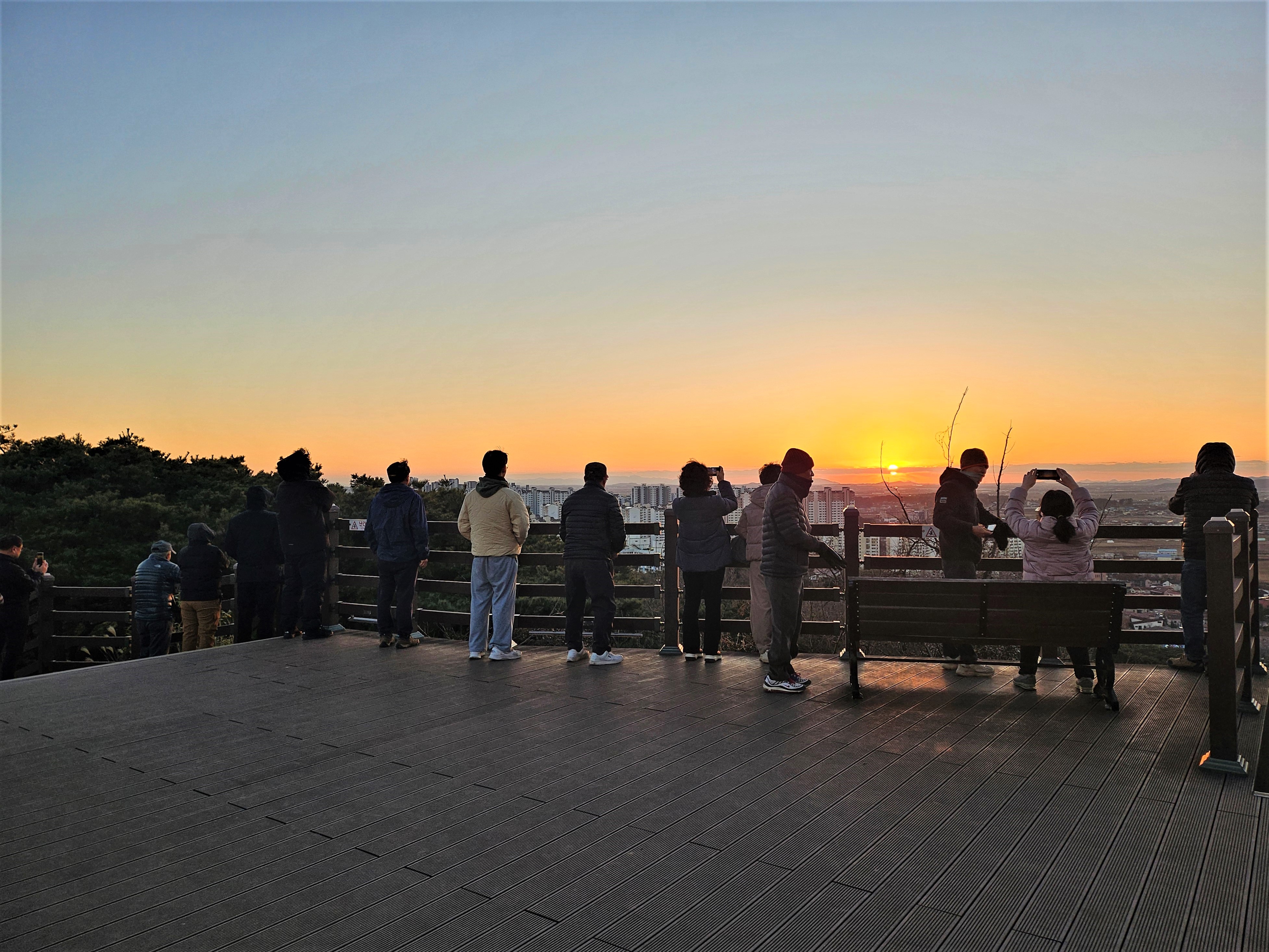 새해 첫날 일출만큼은 아니어도 한 해를 보내려는 시민들이 상당수 배산 정상에 모였습니다. 각자가 정한 일몰명소에 서서 서산 위에 둥둥 떠 있는 해를 바라보며 해가 서산으로 넘어가기만을 기다리고 있었습니다.