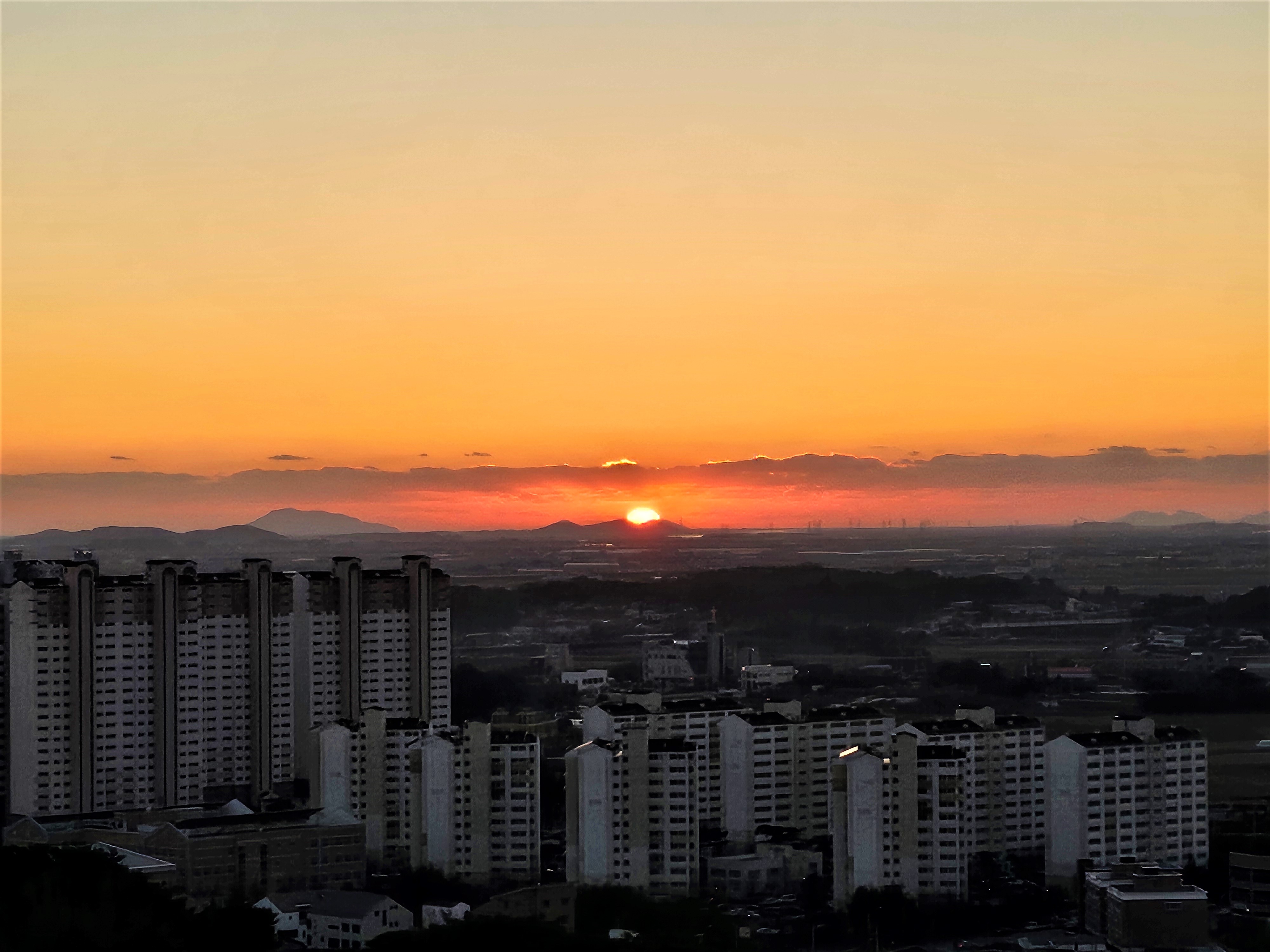 계절에 따라 서해로 넘어가는 일몰 위치가 바뀌는데요. 한여름에는 함라산 남쪽 자락으로 넘어가고요. 한 해 마지막 날에는 모현동 아파트빌딩 숲에 걸쳐 일몰이 넘어가는데요. 아파트와 도심 풍경과 조화를 이루며 더욱 운치 있는 일몰을 자랑합니다.